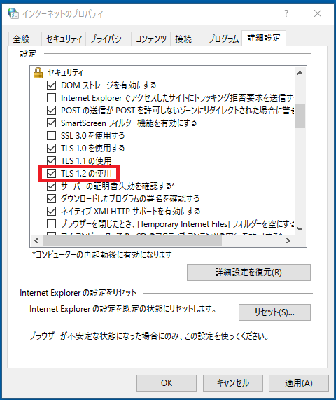 「セキュリティ」の「TLS1.2を使用」をチェックします。